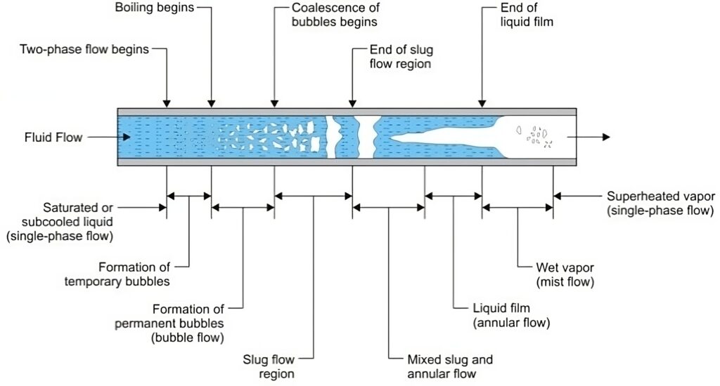 The liquid nitrogen is stored in a bulk storage tank at various saturation pressure, usually between 5 to 10 bars (80 to 150psi). The saturated liquid is drawn from tank and transferred via vacuum jacketed pipelines to the point of use (POU) at the production floor. Liquid nitrogen travels through the pipelines will picks up energy incrementally due of presence of heat leaks, surface friction and turbulence at bends. Depending on the amount of the energy absorbed, the liquid enthalpy increases and vapor is formed creating gas bubbles in liquid stream, resulting in 2-phase flow conditions as shown in diagram below. Appropriate conditioning equipment are used to remove the vapor from 2-phase liquid to provide users with single phase liquid supply.