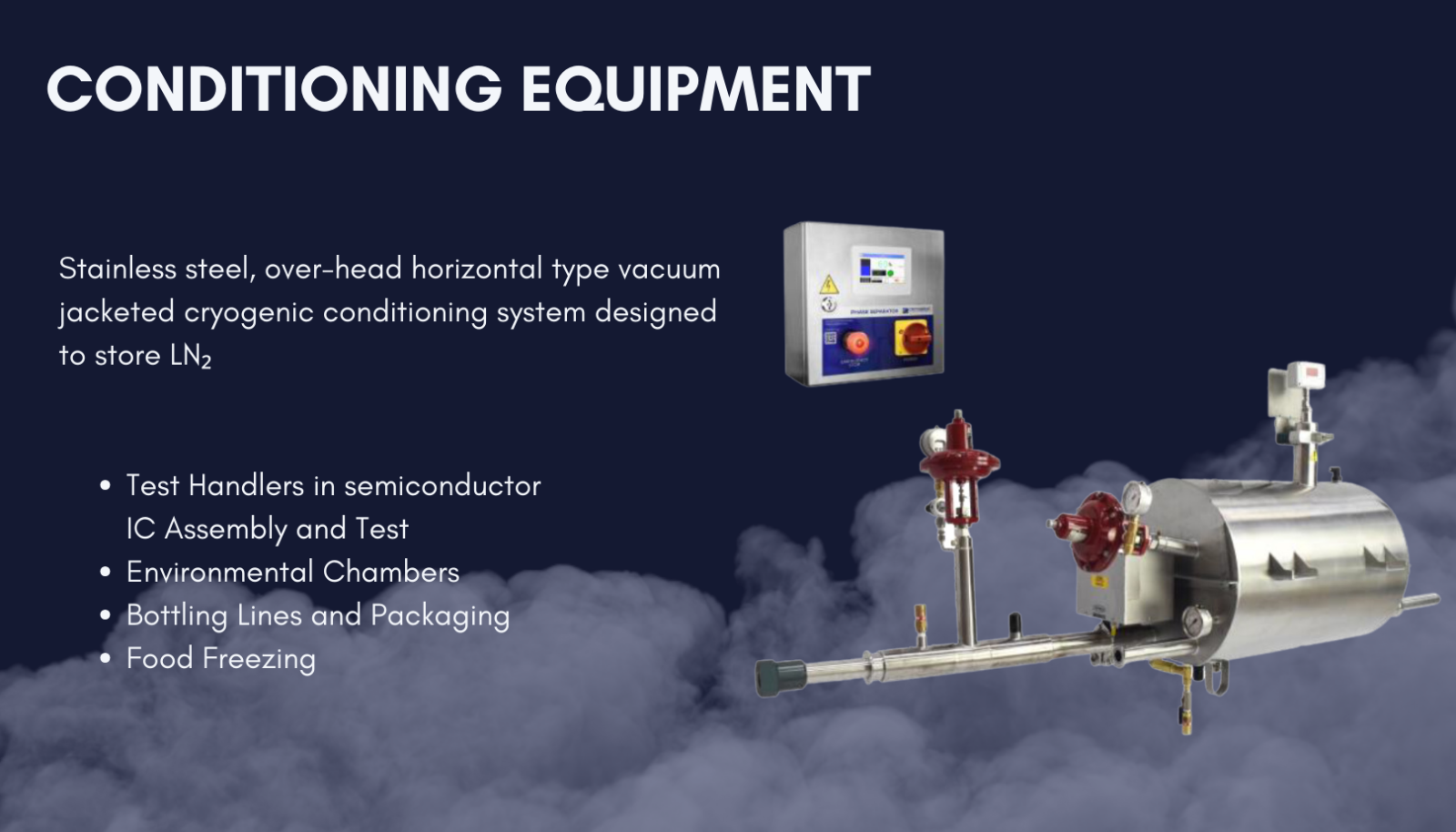There are few types of conditioning equipment available for use. The cryogenic process engineer will determine 2-phase flow conditions by quantifying the heat leaks amount and pressure drop within the pipelines. Proper equipment selection and choosing the right location to install in the pipeline will ensure LN2 transfer system works properly to deliver required liquid quality to each point of use (POU).
